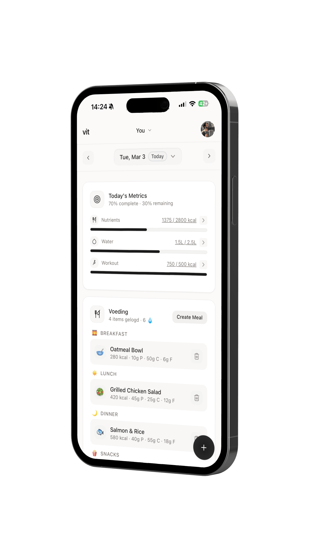 Op basis van jouw lengte, gewicht en leeftijd stelt Vita gepersonaliseerde doelen voor van caloriebehoefte tot doelgewicht. Jij bevestigt, wij tracken.